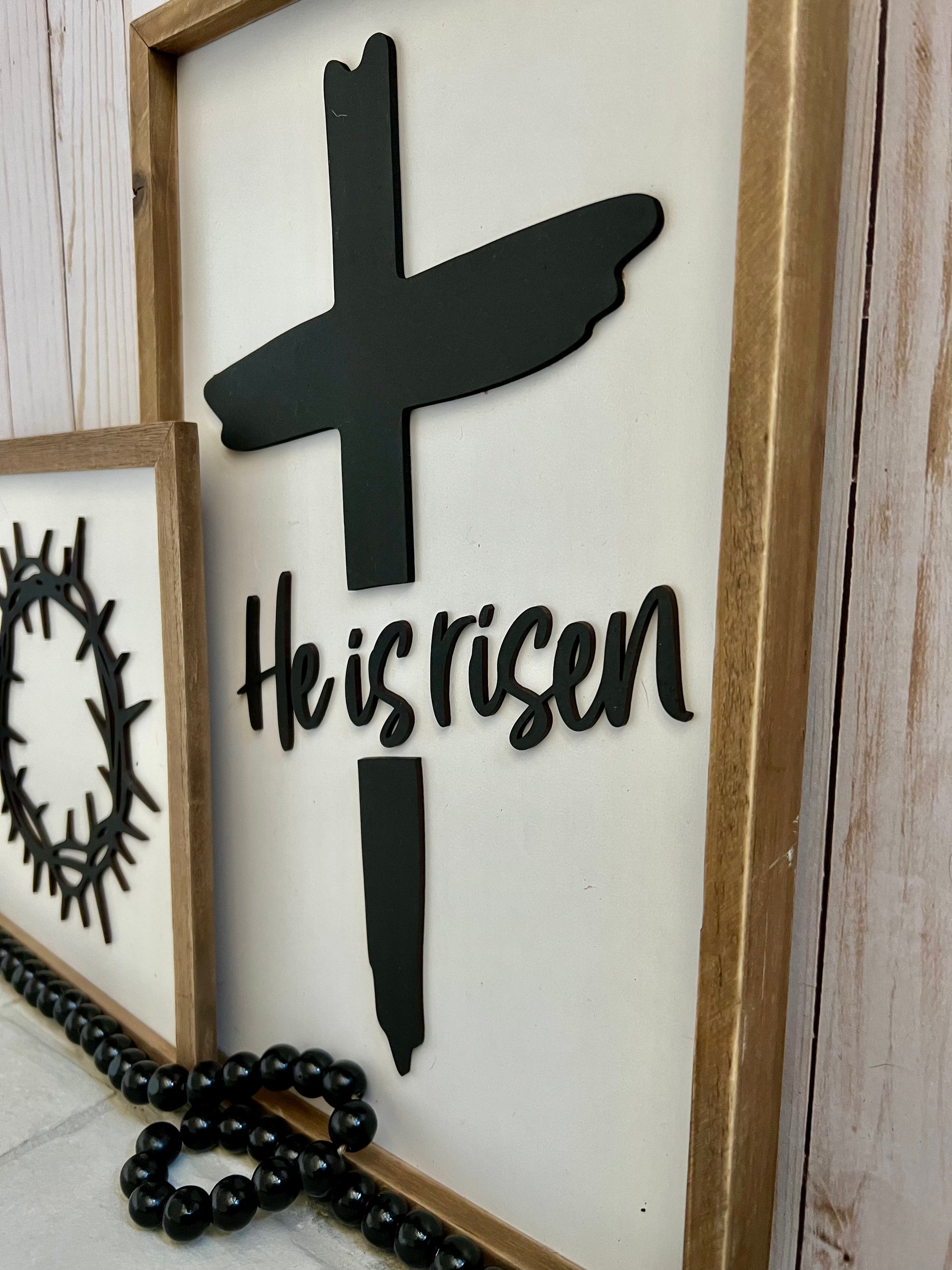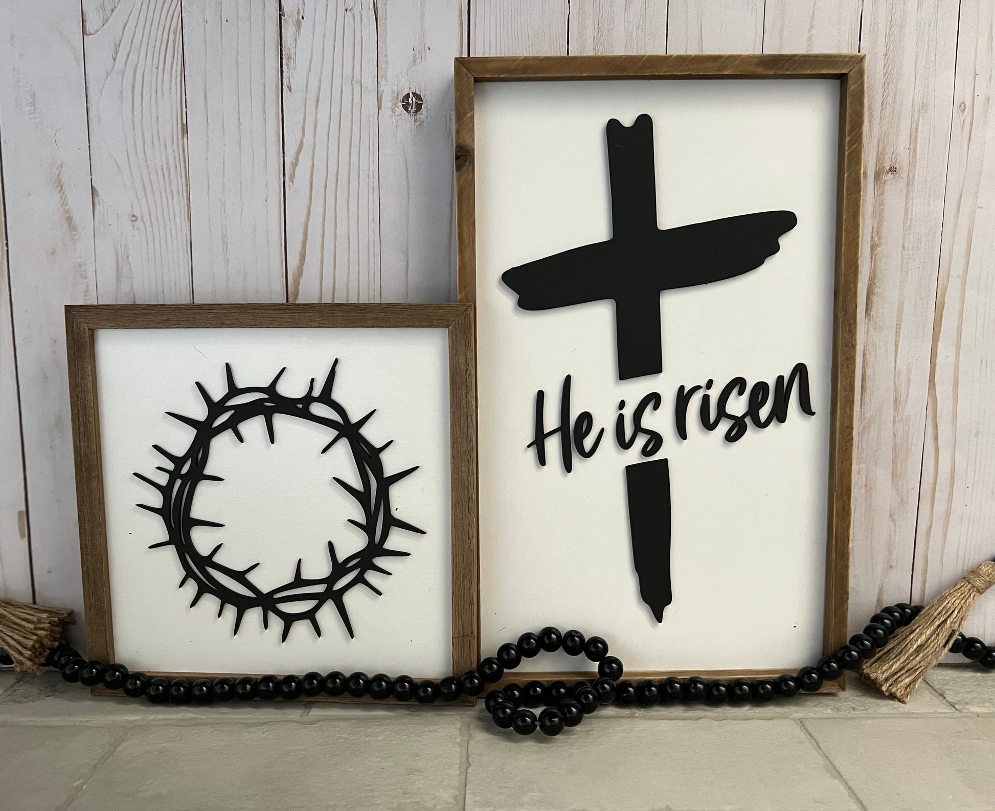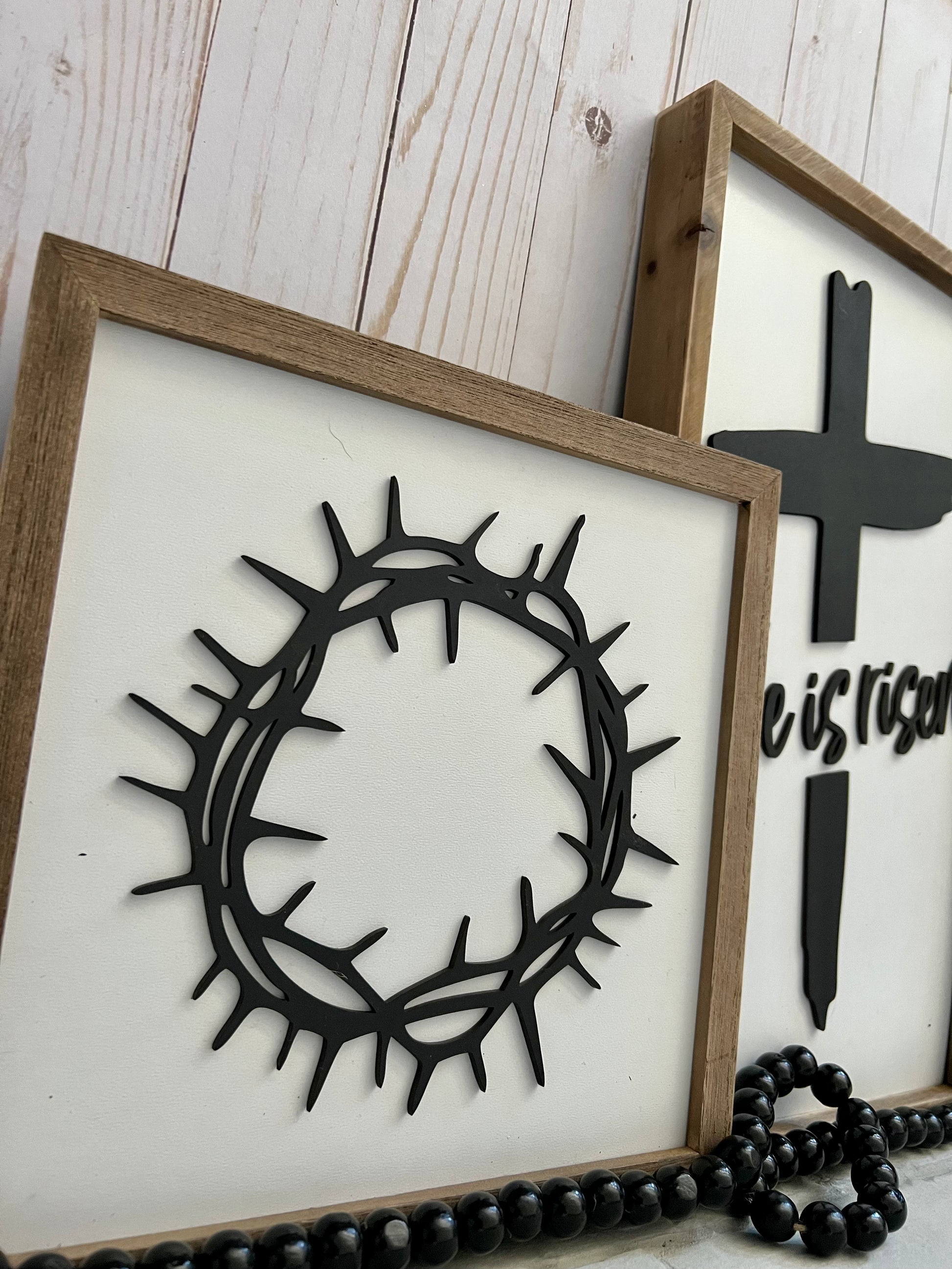 Celebrate Easter with this beautiful crown of thorns and ‘He is Risen’ sign set. They are the perfect addition to your Easter decor.