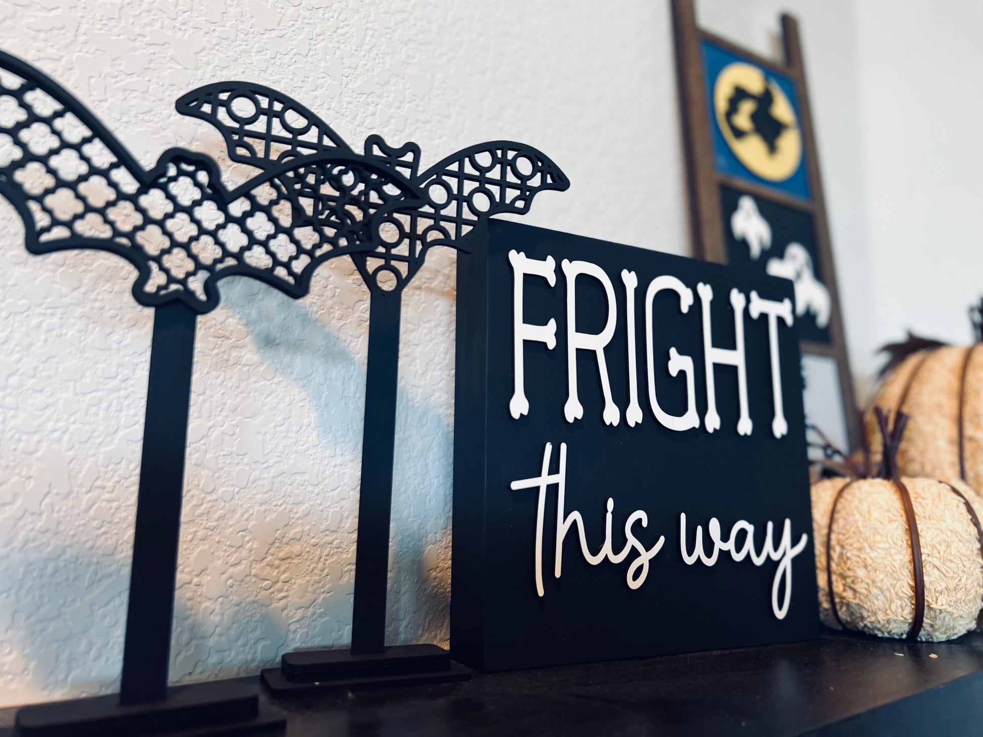 Add a touch of spooky style to your Halloween decor with this "Fright this way" Skeleton Sign