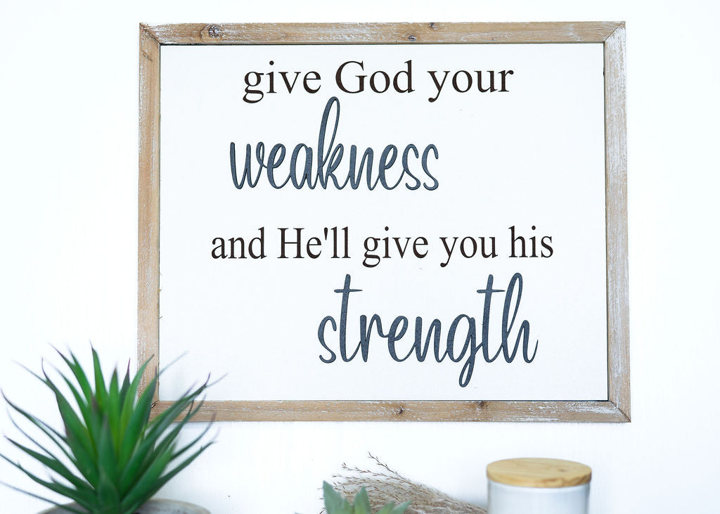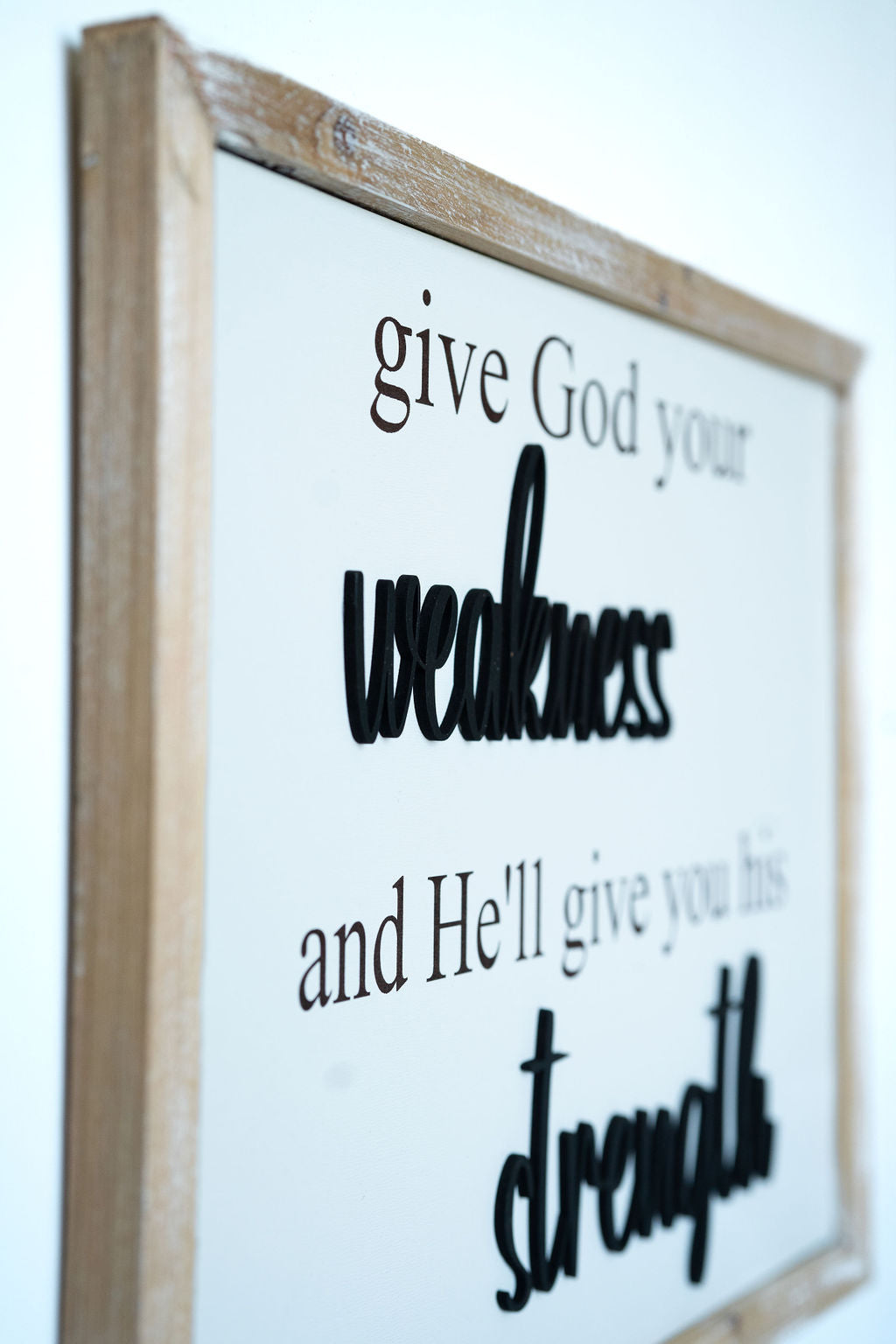 Embrace the power of faith and find inspiration in your daily life with this beautifully crafted wood sign that reads, "Give God your weakness and He'll give you His strength." This inspiring and uplifting quote is a reminder that when we turn to a higher power, we can find strength in our vulnerability.