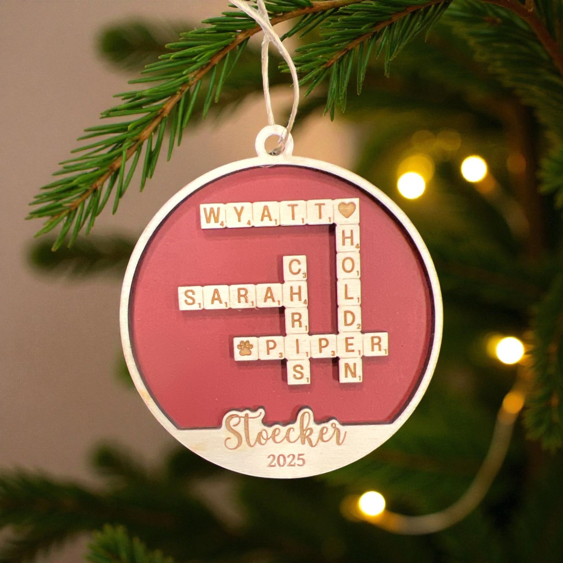 Capture cherished family bonds with this custom 'Family Name' 2025 Christmas ornament. Each name elegantly forms a unique crossword puzzle, reminiscent of beloved Scrabble tiles, creating a heartwarming centerpiece for your holiday tree.