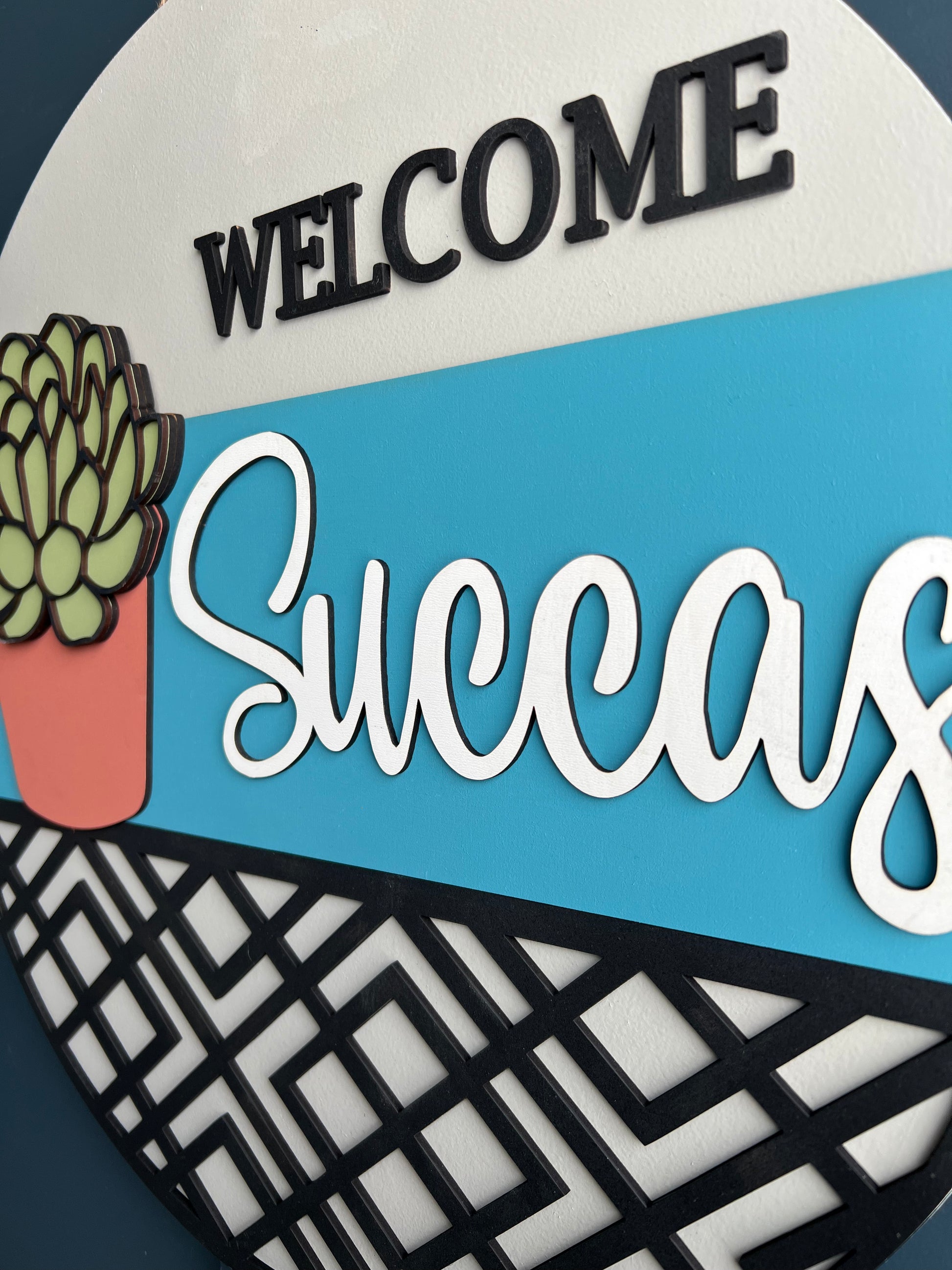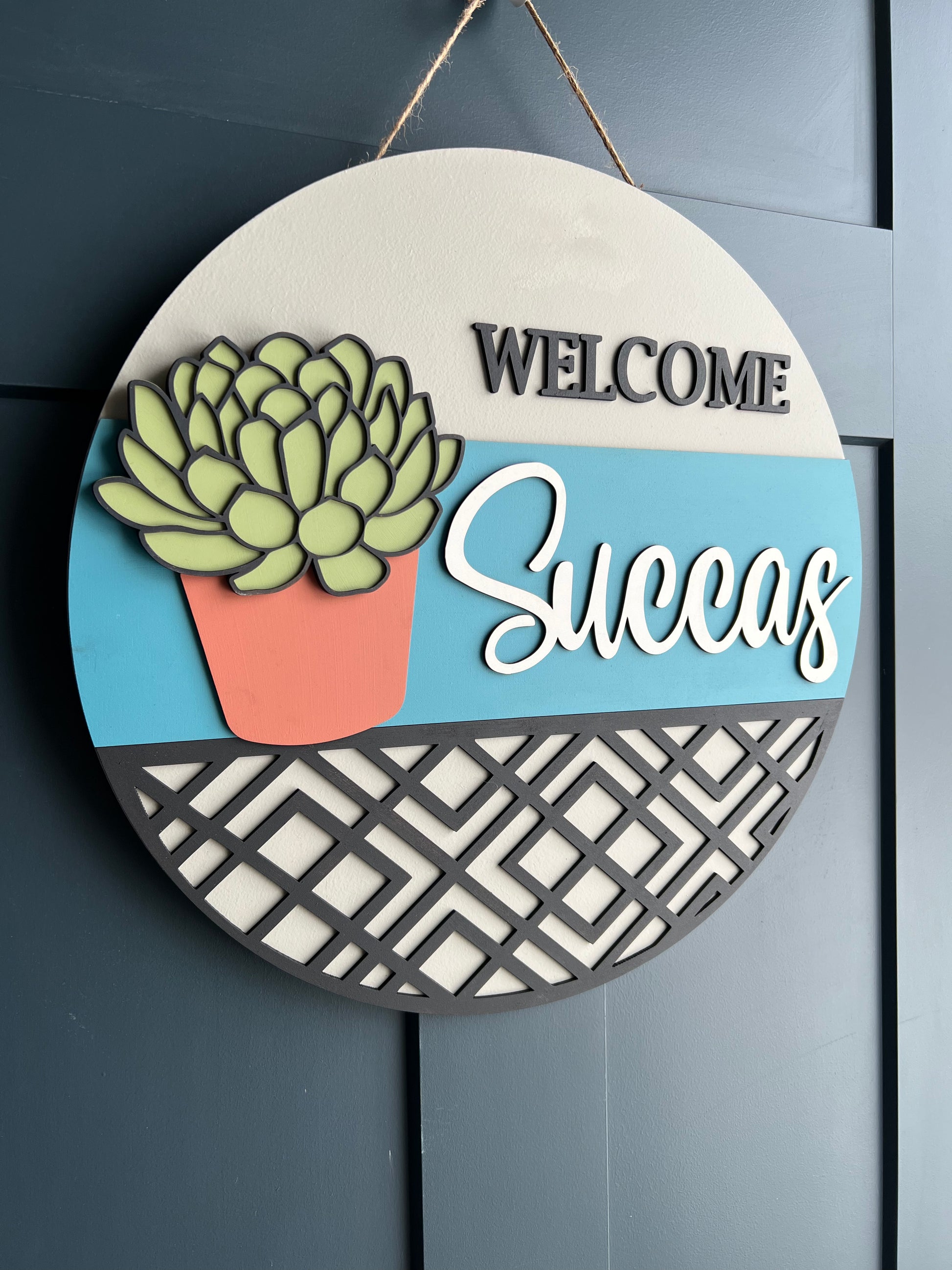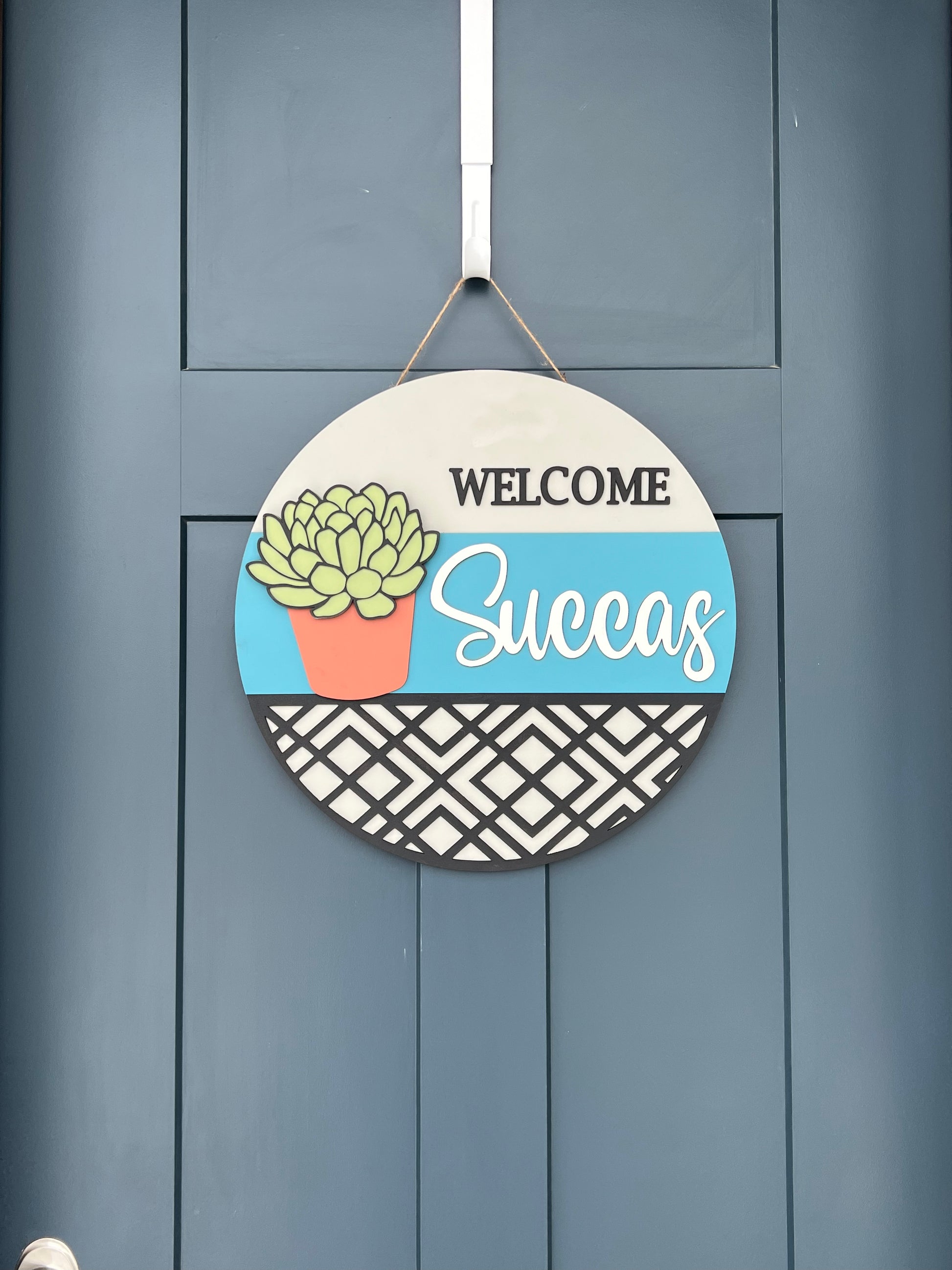 Welcome friends and family with this fun handmade “Welcome Succas” sign. This wood door hanger is perfect for any home that wants to show they’re ready for fun!